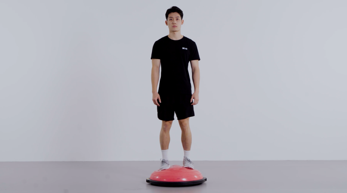 Key Points: Stand on a Bosu ball with arms relaxed at your sides. Breathe evenly and maintain stability. If a Bosu ball is unavailable, stand on a thick pillow. Repeat this exercise for 10 seconds.
