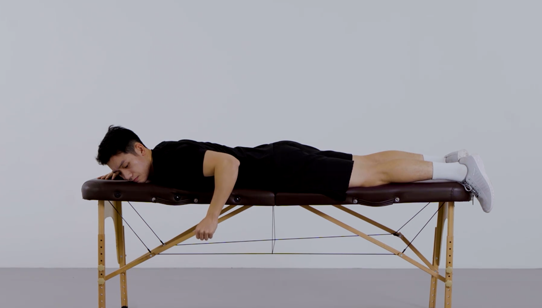 Lie prone with the affected arm extended off the bed, hanging naturally while holding a dumbbell. Exhale as you extend your arm backward, pulling the dumbbell upward. Inhale as you return to the starting position. Hold for approximately 16 seconds.