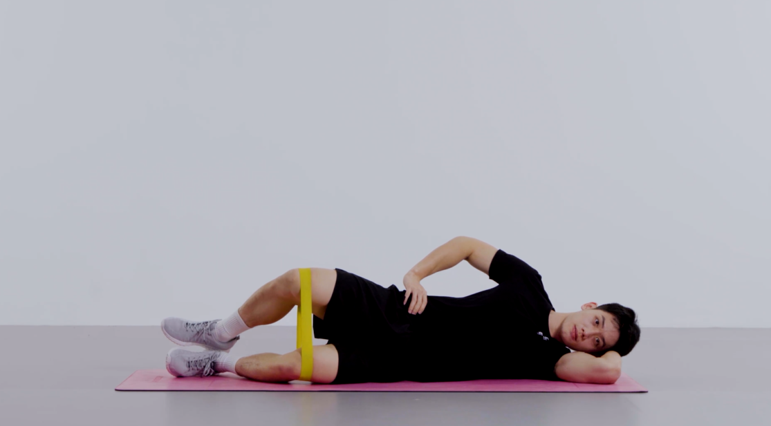 Lie on your side with hips and knees bent. Position the resistance band just above your knees. Exhale as you open your legs outward. Inhale as you lower the raised leg, maintaining stability throughout. Place hands on your waist for support. Repeat for approximately 24 seconds.