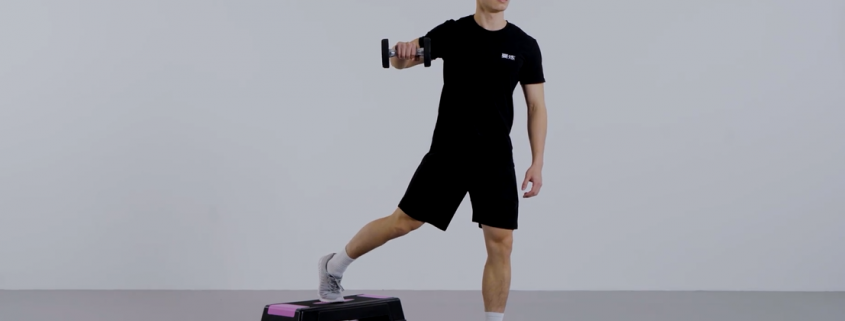 Place the foot on the same side as the affected arm on a step platform. Stand upright with the affected arm holding a dumbbell, then lean forward. Pull the dumbbell upward while rotating your torso backward. Repeat the exercise. Perform for approximately 20 seconds.