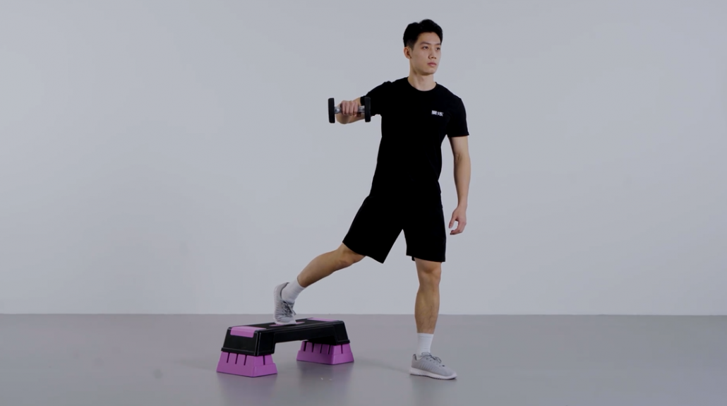 Place the foot on the same side as the affected arm on a step platform. Stand upright with the affected arm holding a dumbbell, then lean forward. Pull the dumbbell upward while rotating your torso backward. Repeat the exercise. Perform for approximately 20 seconds.